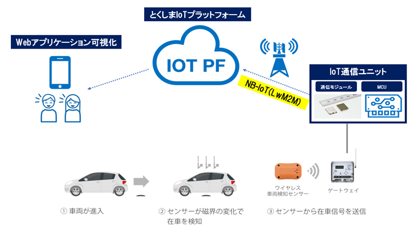このシステムは、駐車スペースにセンサーを設置して在車状況を検知することで、駐車場の空き情報をスマートフォンやタブレット等からリアルタイムに確認できるものです。オプテックスが開発した、車両検知センサーなどを活用したワイヤレス満空管理システムを利用して、そこから得られた在車情報(信号)をソフトバンクのNB-IoTを介して徳島県の「とくしまIoTプラットフォーム」に送信し、日本システム開発がその情報をもとに駐車場の満空情報を可視化するWebアプリケーションを提供しています。なお、NB-IoTを活用したスマートパーキングシステムが利用されるのは、公営駐車場では国内で初めてです。