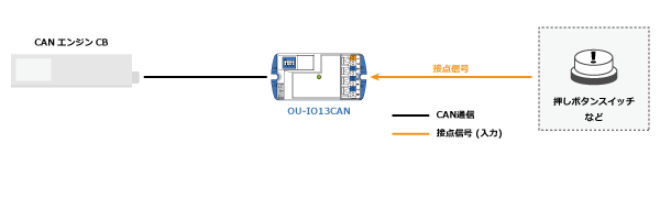押しボタンスイッチなどの外部入力の接点信号を、OU-IO13CANを介してCAN信号に変換し、CANドアシステムに接続することで、自動ドアの開閉が可能となります。